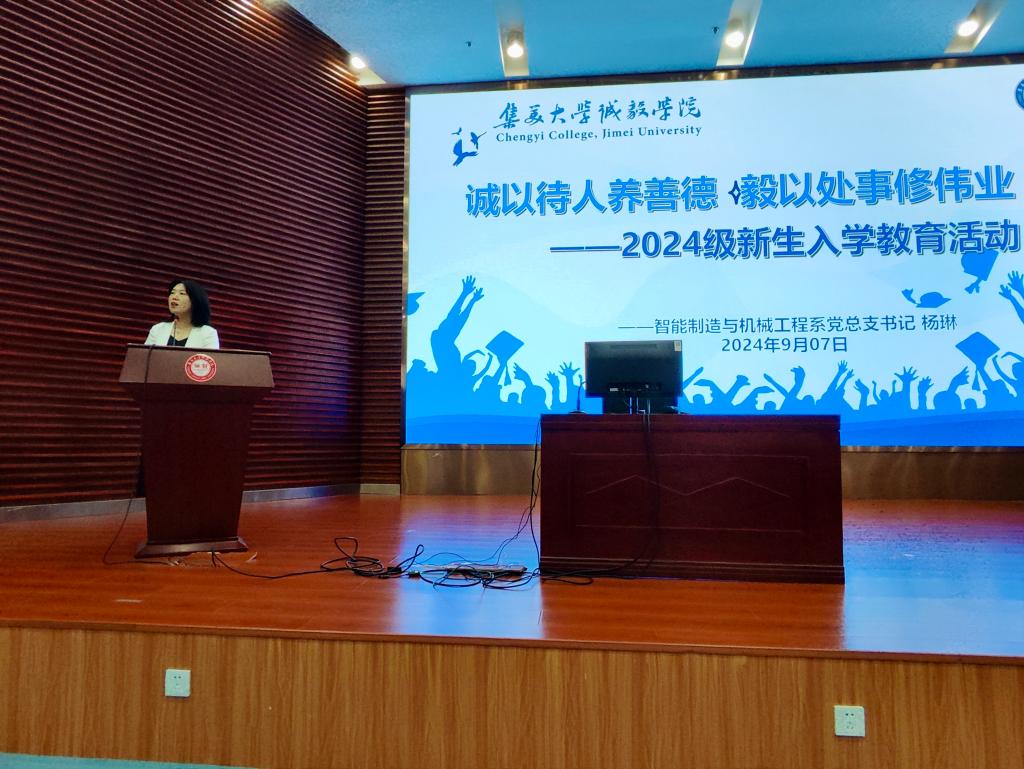 系党总支书记杨琳为新生开展“诚以待人养善德 毅以处事修伟业”的主题教育讲座。杨琳带领新生回顾了诚毅学院20年的奋斗历程,介绍了智能制造与机械工程系近年来取得的一系列成就,对正在迈入人生新篇章的2024级本科新生提出希望,勉励同学们传承机械系的光荣传统,充分利用大学平台,积极参加各项比赛和活动,全面提升个人素质,度过一个充实而美好的大学。同时,她还强调了校园各项管理规定,并开展各类安全教育,引导新生增强自我防护意识,注意防范网络风险,共同维护校园和谐稳定。
