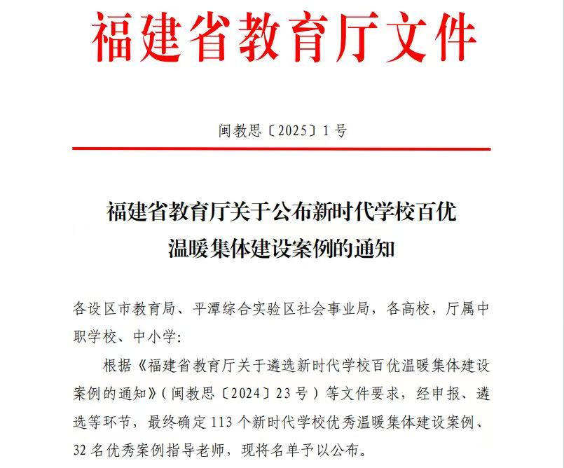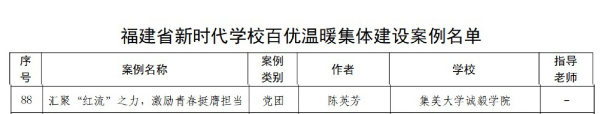 近日,福建省教育厅发布了《关于公布新时代学校百优温暖集体建设案例的通知》,我系申报的案例《汇聚“红流”之力,激励青春挺膺担当》(作者:智能制造与机械工程系学生第一党支部书记 陈英芳)成功入选。