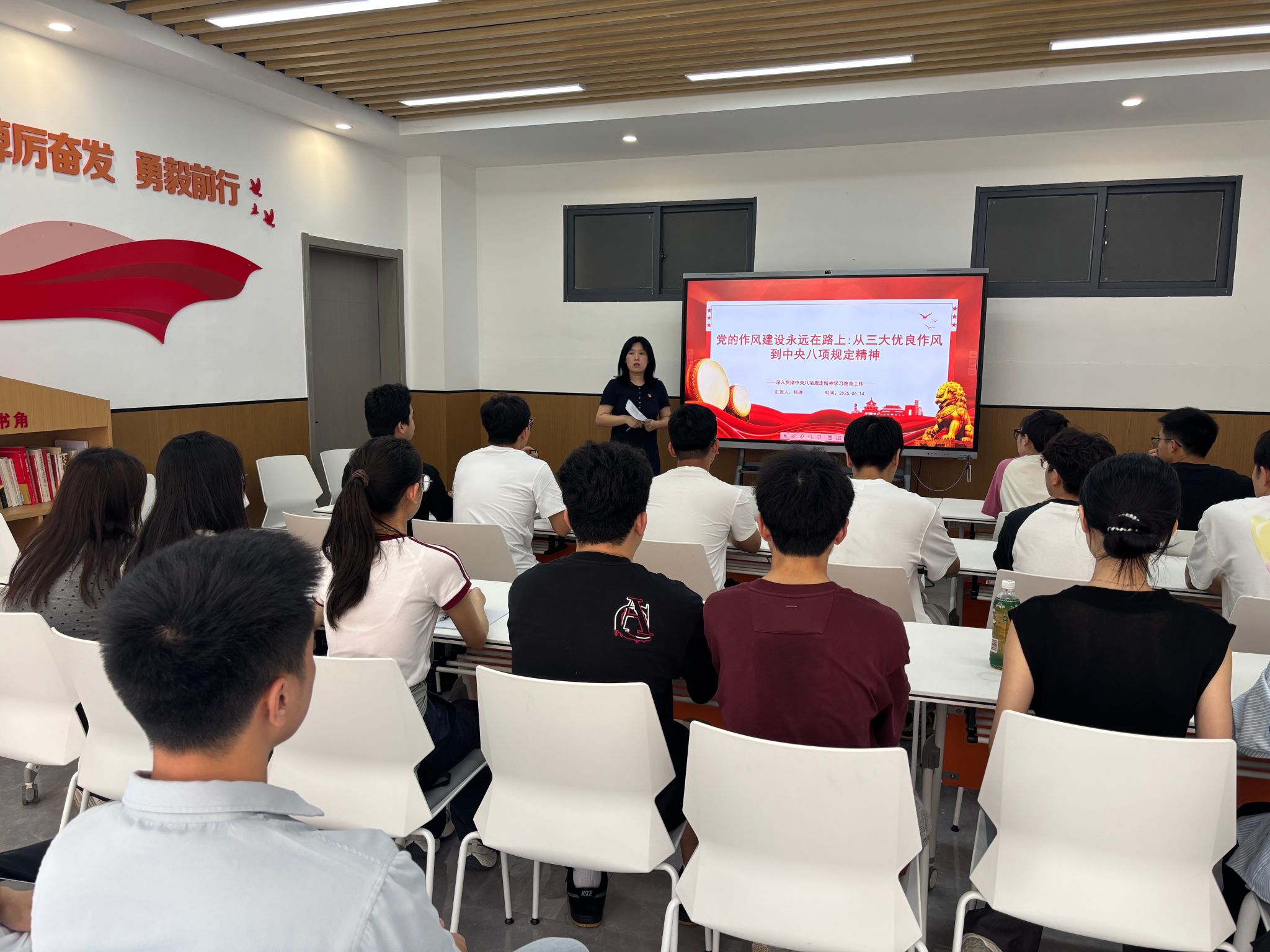 优良作风传薪火,八项规定正党风。党课开篇,杨琳带领党员们回顾党的三大优良作风,深刻阐述了党的作风建设在党的建设体系中占据的重要地位,强调其与党的形象塑造以及事业长远发展息息相关。随后,详细解读中央八项规定及中央八项规定精神,并组织党员共同学习《党政机关厉行节约反对浪费条例》。在讲解贯彻落实中央八项规定精神的成效经验时,杨琳列举了学院近年来在精简会议文件、规范公务接待、优化工作流程等方面取得的显著成果。同时,她通过实际案例,深入剖析了违反中央八项规定精神的危害,强调了纪律红线不可触碰。并指出,违规行为不仅损害了党的形象,破坏了干群关系,还可能导致学院发展受阻,要求全体党员引以为戒,时刻保持警醒。
