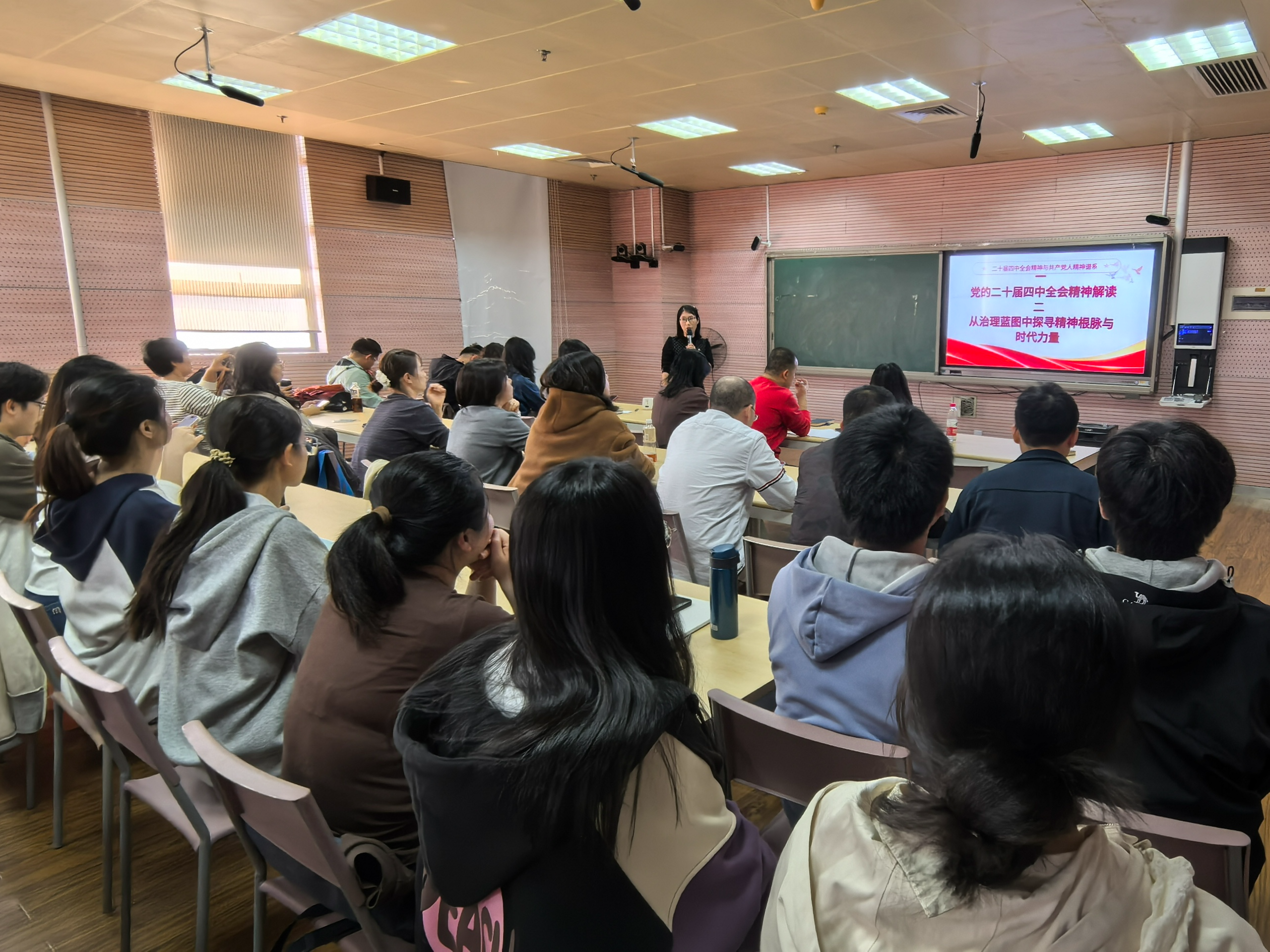 陈亚红以“百年精神谱系,一脉全会新声——中国共产党人的精神传承和时代答卷”为主题,围绕党的二十届四中全会精神、“十四五”成绩、“十五五”规划,及中国共产党人精神谱系对个人发展的启示等方面展开。她以“四中全会”的会议定义为切入点,围绕党的二十届四中全会精神的核心要义进行解读,带领大家回顾了“十四五”规划取得的重大成绩,详细介绍了“十五五”规划的重要意义、机遇挑战、遵循原则及主要目标。同时介绍了中国共产党人精神谱系的内涵实质:系统梳理2021年党中央发布的46种伟大精神,内核为理想信念、为人民服务、实事求是、独立自主。重点阐释了精神谱系对个人的重要启示。最后,她对师生党员在个人成长方面提出了宝贵建议。